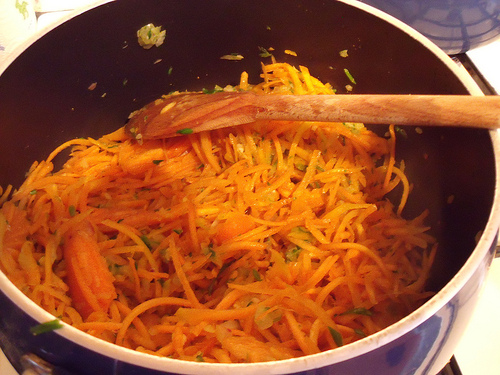 Once the onions have softened up, add in all of the carrots and allow to cook on a medium heat for up to 10 minutes. Stir the mixture (that looks like a hot salad!) around from time to time to make sure the carrots are evenly cooking.