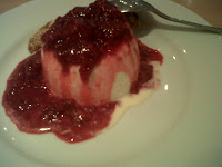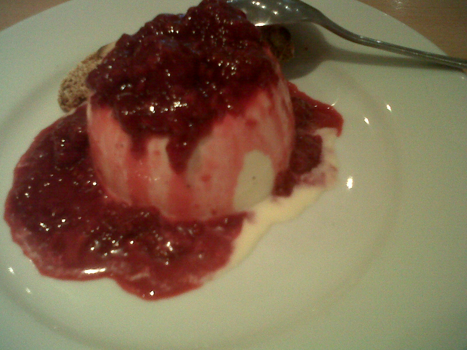 As is was my birthday, we pigged out a bit unnecessarily and ordered a couple more glasses of the bubbly stuff, and dessert. G had the Venetian Rice Pudding, and I ordered the amaretto panna cotta with raspberries and home-made biscotti. I had no idea what to expect to be Venetian in the rice pudding ( well, would you?) but turned out to be ‘pimped’ with some raisins and orange peel and maybe a little spice. I was too busy slowly but surely decimating my panna cotta which was superb. A subtle taste of almonds through it and not too much of that ‘gelatinous’ texture you sometimes get with this pud. The fruity compote was familiar (i.e. I think identical) to the one which came on the choccie cake I had at The Dogs in December. The only let down was the biscotti – just lacking a bit of flavour and sweetness.