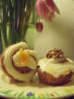 The next thing the girl might do is figure out how to make some lower-fat cakes. So yesterday morning, I trawled the interweb and world of online recipes to find some likely candidates. The first one I came across was on the Waitrose website, and was for zesty carrot and orange cupcakes. I know I’ve posted a carrot cake recipe before, but reckon that one might be too heavy to work well for muffins or cupcakes. I did a bit of tampering by adding in some walnuts (naughty!) and freshly grated ginger, but also reduced the fat content by minimising the oil, and also using extra light Philly cheese for the icing. The frosting was a lot more ‘wet’ than with regular creme cheese, but I figured it was worth a small compromise, seeing as we were being virtuous and all, and means I can eat more!